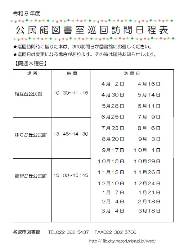 公民館図書室への巡回 図書館司書が2週間おきに公民館図書室を(1回45分程度)訪問します。公民館図書室にも本が並んでいますが、訪問時には図書館の蔵書を持参し貸出します。 ※巡回訪問の際には名取市図書館から借りた本も返却することができます。